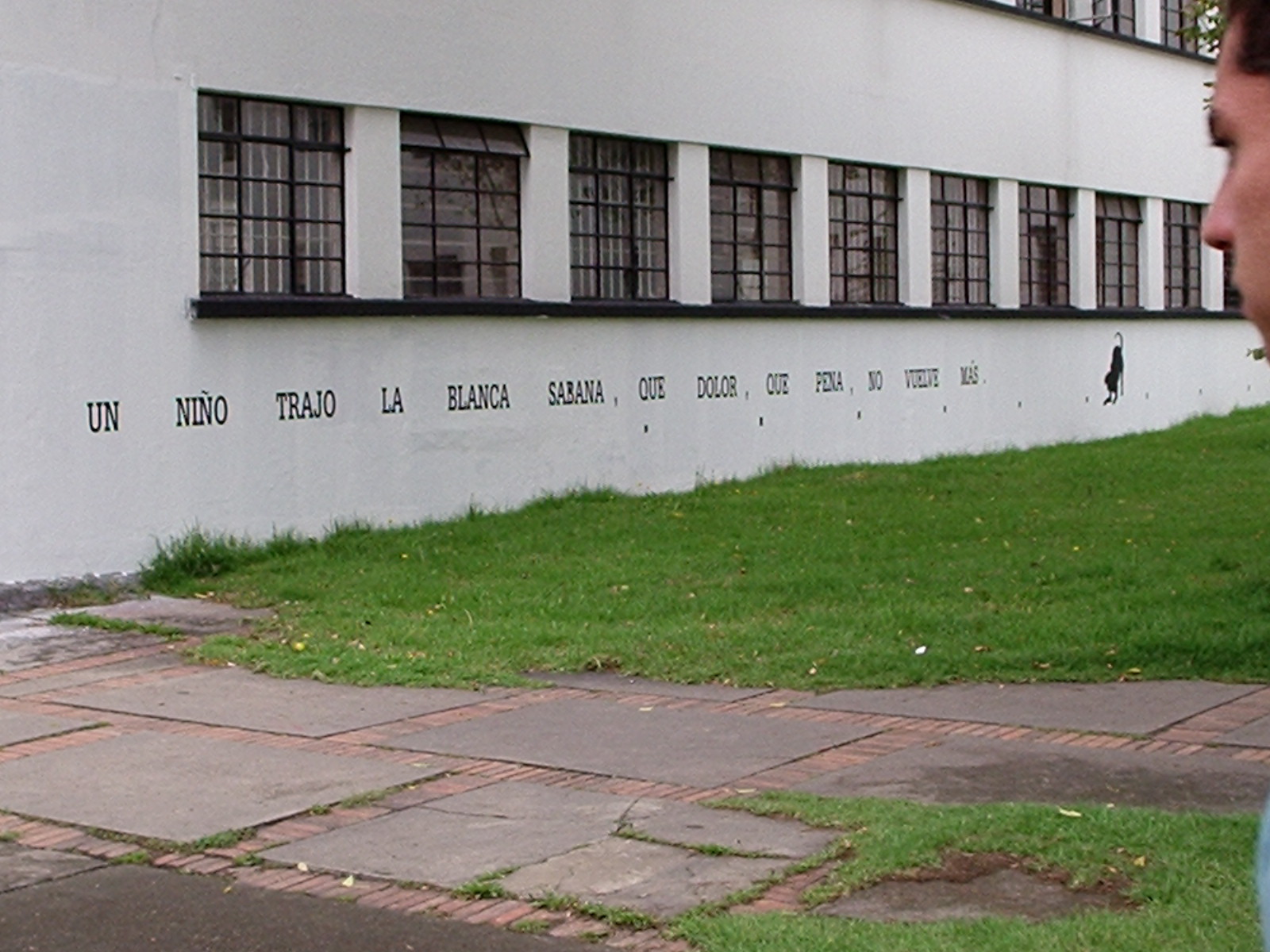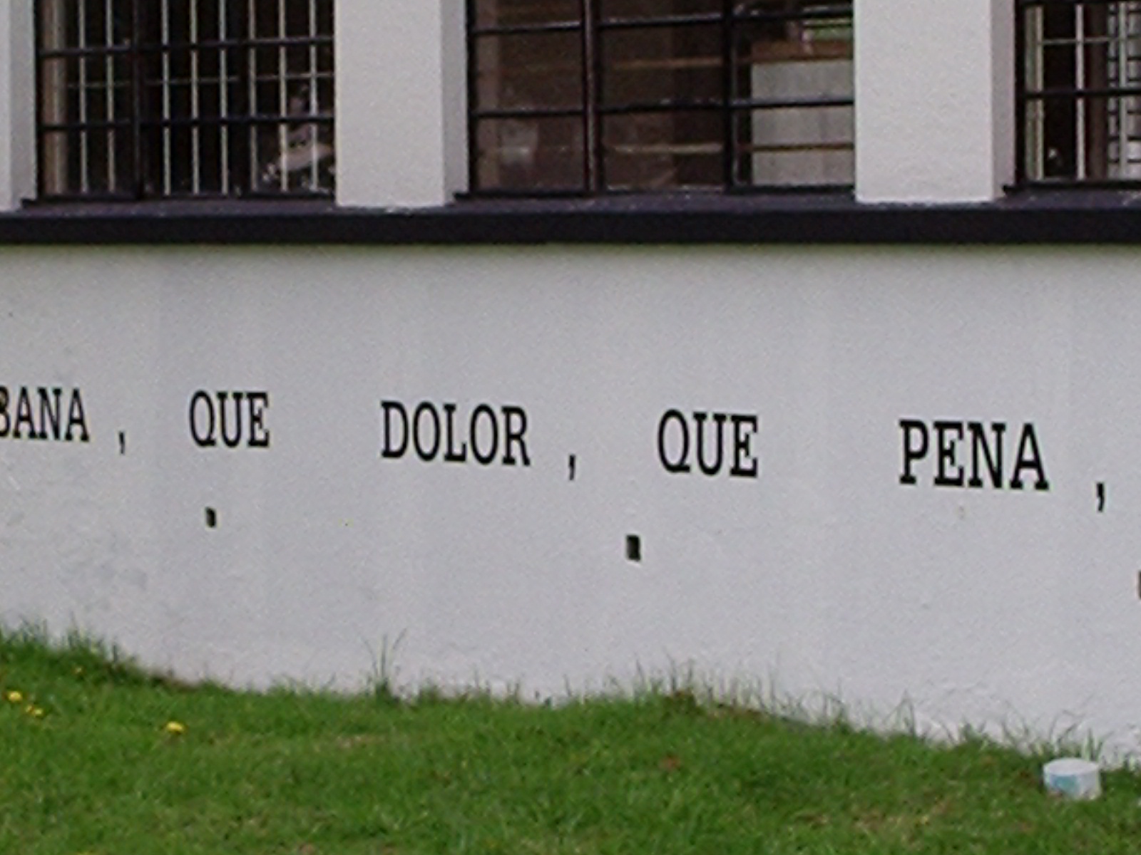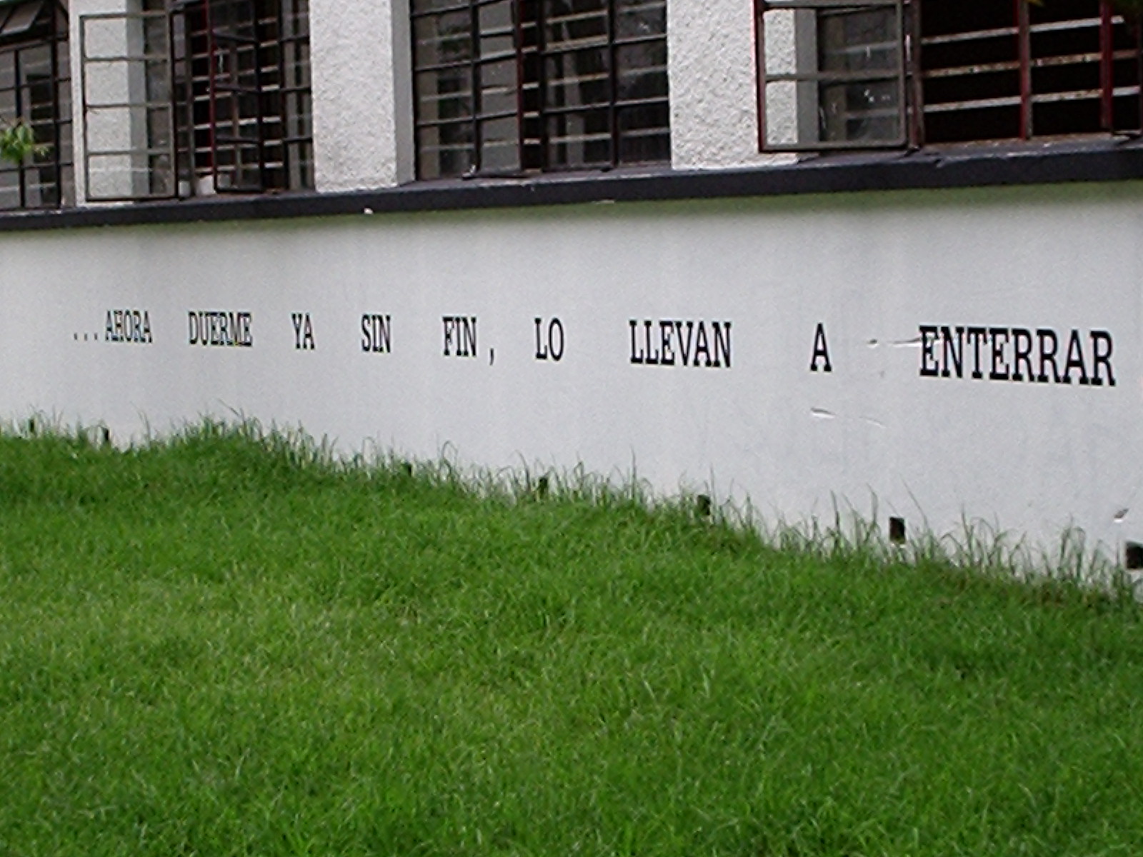 Desarrollamos la intervención escribiendo un texto que surgió de algunos pasajes de García Lorca y de la ronda infantil de Mambrú se fue a la guerra, este texto lo pusimos con plotter de corte sobre las paredes de los edificios de Diseño Grafico y de Idiomas en las paredes que dan a la entrada de la 26 rodeando el espectro visual de los transeúntes que entraban a la universidad en su camino hacia la Plaza Che o los edificios aledaños. Este texto lo acompañamos con la figura de un perro sobre las mismas paredes y en otros puntos en el suelo que generaban un recorrido.